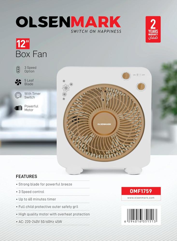 مروحة بإطار مربع من أولسن مارك 12 إنش – تبريد قوي وأمان كامل استمتع بالهواء المنعش والأداء القوي مع مروحة أولسن مارك المميزة بتصميم عصري وميزات عملية لتلبية احتياجاتك داخل المنزل أو المكتب.